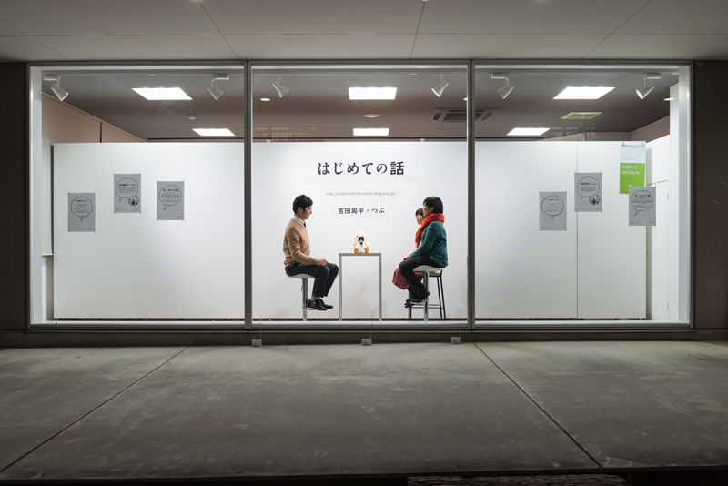 学生・スタッフ・展覧会の関係者等を巻き込みながら、様々な「はじめての話」をする場を設け、そこで起こる状況を作品とした。