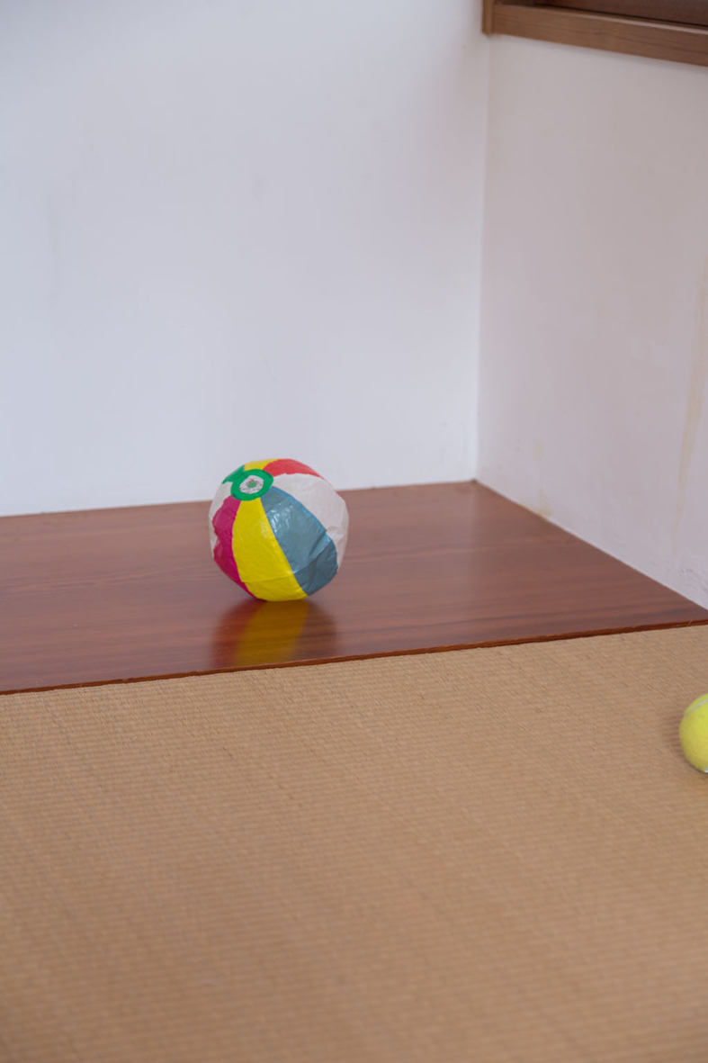 ボールや果物などの丸いものを、ギャラリーの屋内外に散在させた作品。