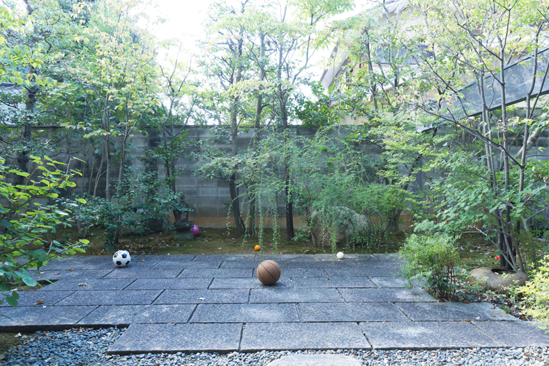 ボールや果物などの丸いものを、ギャラリーの屋内外に散在させた作品。