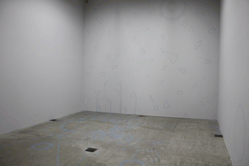 無題 チョーク、棚、既に展示されていた他の作家の作品 2008 期間中6名の作家が順番に同じ空間に作品を追加していくという展覧会において、 既に展示されていた他者の作品の輪郭を、青いチョークで展示空間の床面や壁面に型取り転写。 チョークの線だけを残し作品は移動させ、ギャラリー入口に設置した棚に並べる。