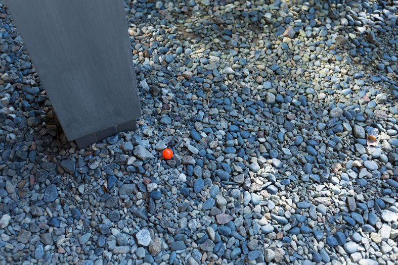 ボールや果物などの丸いものを、ギャラリーの屋内外に散在させた作品。