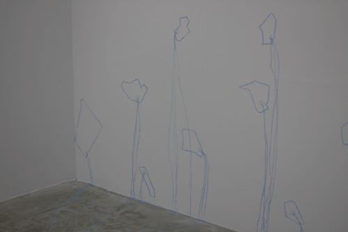 無題 チョーク、棚、既に展示されていた他の作家の作品 2008 期間中6名の作家が順番に同じ空間に作品を追加していくという展覧会において、 既に展示されていた他者の作品の輪郭を、青いチョークで展示空間の床面や壁面に型取り転写。 チョークの線だけを残し作品は移動させ、ギャラリー入口に設置した棚に並べる。